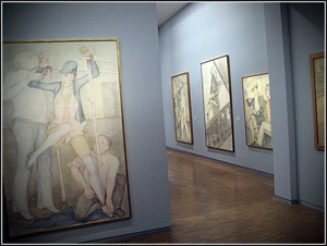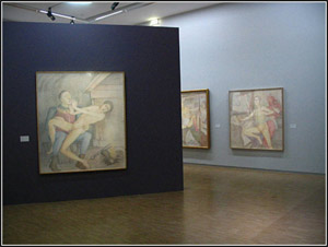 Agnès de la Beaumelle, commissaire de l’exposiiton, Marie-Odile Caussin-Peynet, chargée de la réalisation, et Anouk Matecki, architecte, ont réussi une belle scénographie en cassant l'accrochage classique sur des murs bleu pastel par des cloisons obliques très sombres.