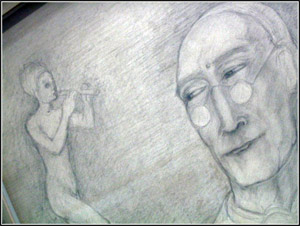 Des dessins plats, à deux dimensions, aux personnages grandeur nature sans chair, sans corporéité, qui devien tun simulacre, dont le trait et la manière, si ce n'est la substitution des crayons de couleur à la mine de plomb, ne varieront jamais.